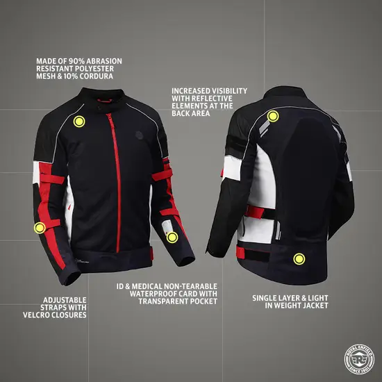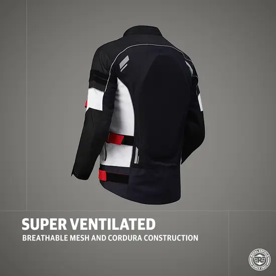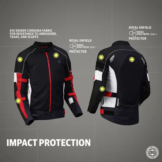 Armoured with Royal Enfield Ergo Pro-tech CE level 2 armours, 90% mesh construction to keep you cool, and personalized Velcro patches to keep your style on point.